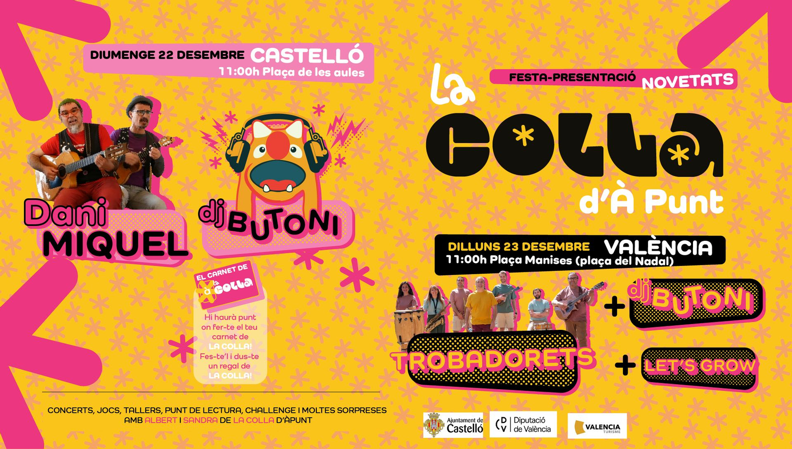 Ja són 22.000 les xiquetes i els xiquets de la Comunitat Valenciana que formen part de La Colla, però À Punt aposta per donar un impuls a l’espai infantil dels mitjans públics valencians. Així, el diumenge 22 de desembre, a les 11 del matí, se celebrarà la primera festa de presentació de la nova Colla a Castelló de la Plana, concretament a la plaça de les Aules. La plaça de Manises de València també acollirà una festa el dilluns 23 de desembre i a Alacant la presentació es farà a Exponadal.