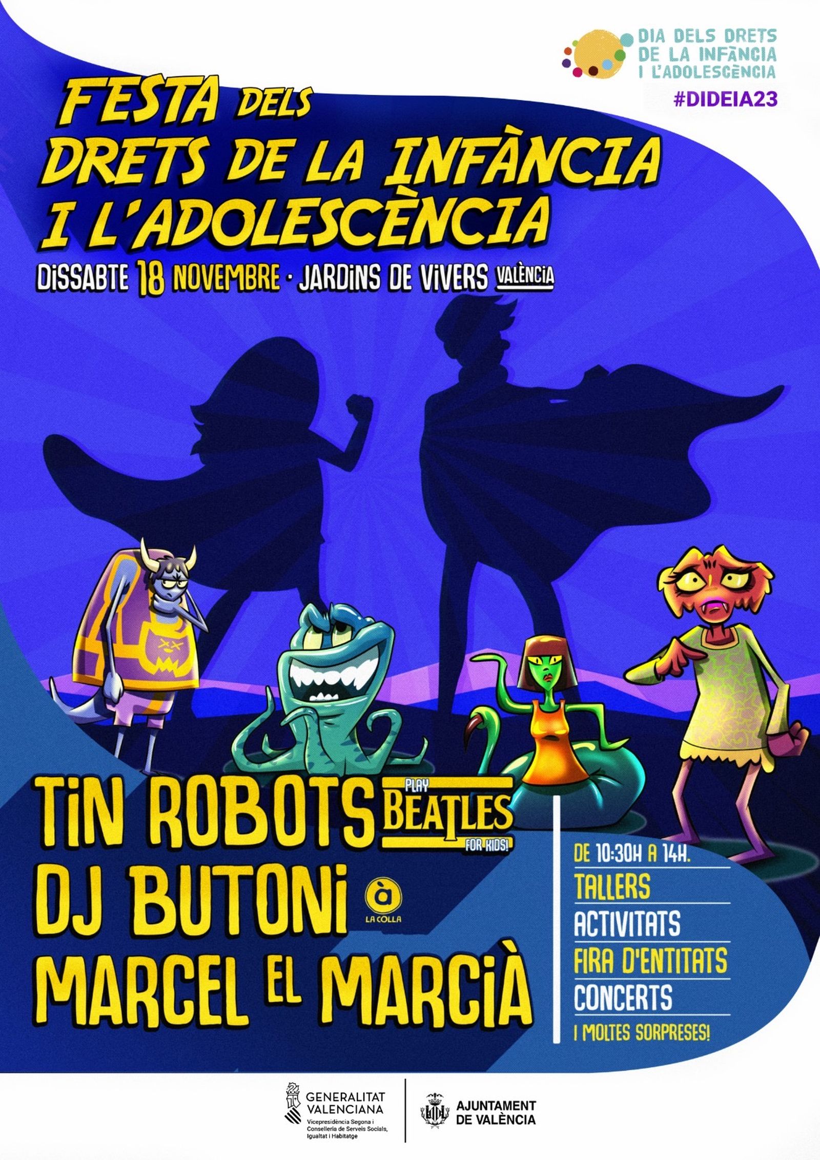 La festa de València arrancarà a les 10:30 h, amb tallers, activitats i moltes sorpreses, i amb Laia i Pau, que correran per a no faltar a aquesta gran cita a favor dels drets de la infància i l'adolescència. També estarà la música de La Colla, amb Marcel el Marcià i Dj Butoni, que s'han comboiat per a cantar les seues cançons.