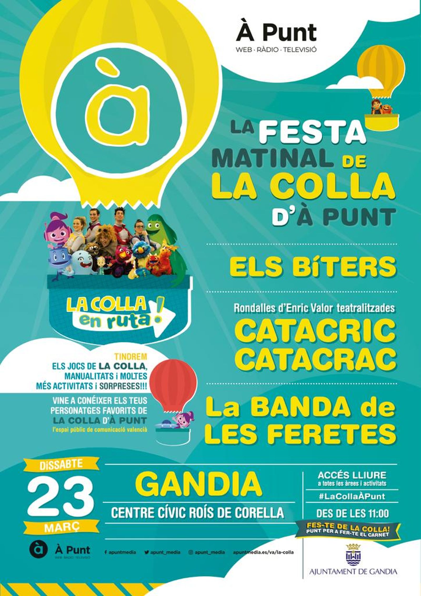 El festival itinerant La Colla en Ruta s’instal·la al Centre Cívic Roís de Corella de Gandia el pròxim dissabte 23 de març. La nova edició de La Colla en Ruta comptarà amb un complet programa d’activitats, tallers i concerts als quals es podrà accedir de forma gratuïta. Al voltant de 10.000 persones assistiren a la primera edició de La Colla en Ruta a Castelló.